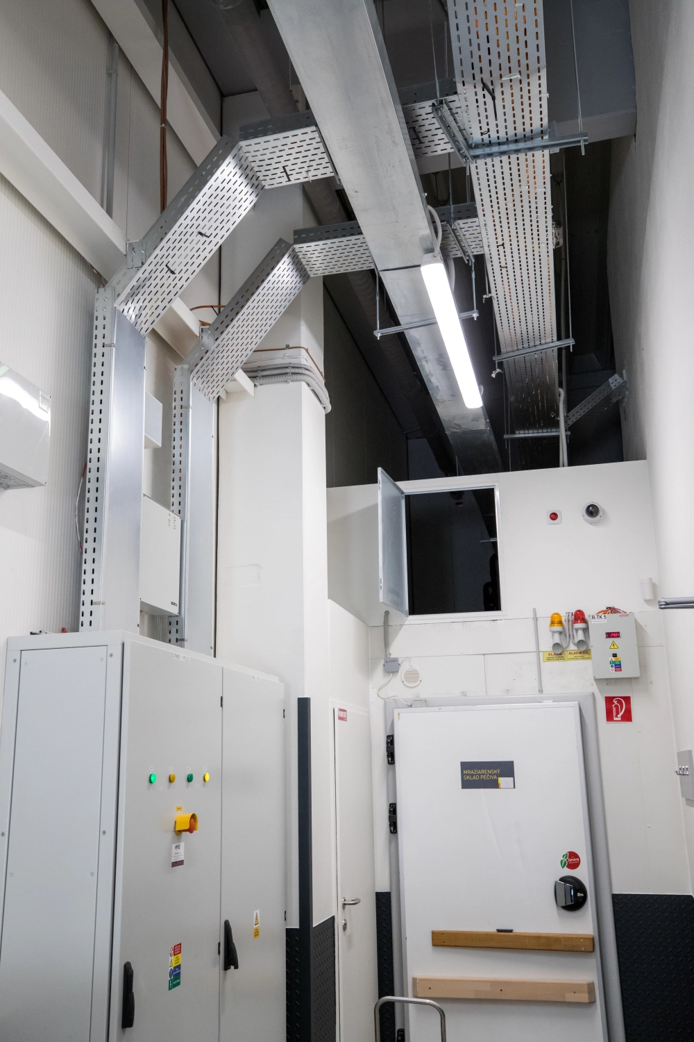 Súčasťou riešenia bol hlavný rozvádzač RMS1 od spoločnosti TAKEL s.r.o. (250 A) s prepäťovou ochranou triedy B+C a blokáciou sieť/diesel, rozvádzač RMS2 pre zásuvkové obvody a riadenie osvetlenia cez systém DALI, samostatný rozvádzač RMS3 pre elektrickú pec, vonkajší rozvádzač RDA pripravený na pripojenie mobilného dieselagregátu a rozvádzač DTV pre riadenie ventilácie podľa úrovne CO₂.